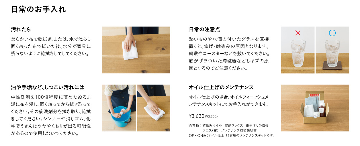 木部は、仕上げによって“正解”が変わります。飛騨産業のサポート情報でも、輪ジミ対策として水分のあるものを直接置かないこと、熱いものを直接置かないことが注意点として挙げられています。また、オイル仕上げは定期的なメンテナンスが必要で、メンテナンスキットを用いたお手入れも案内されています。こうした基本を押さえるだけで、テーブルやチェアのコンディションは大きく変わります。