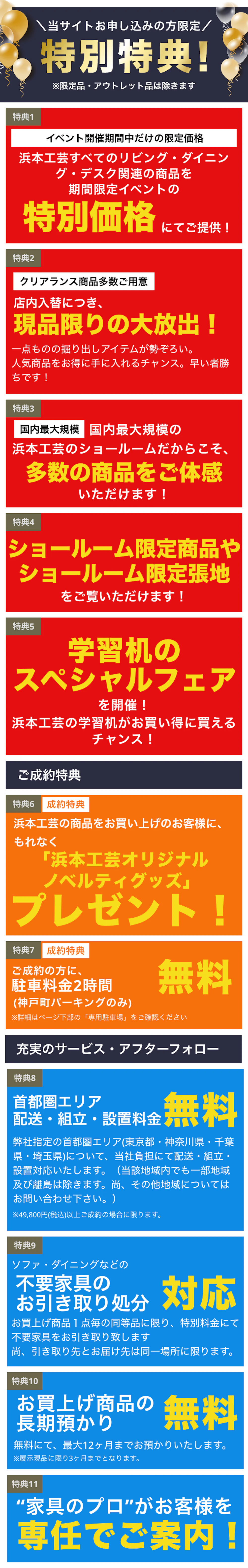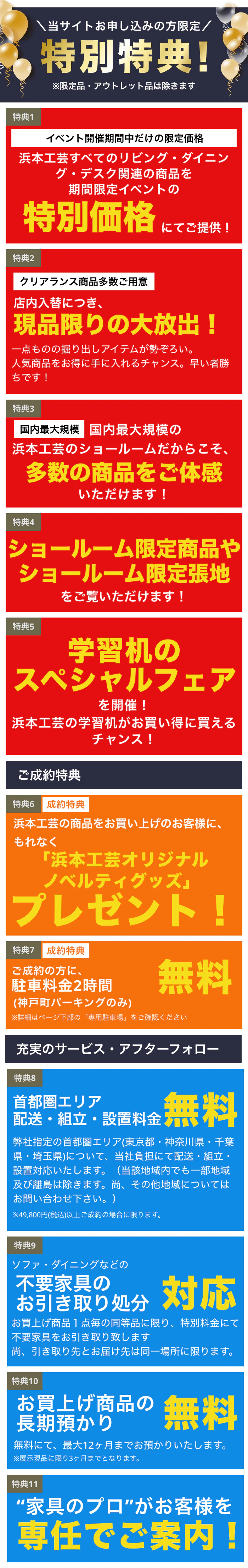 | 不用品のお引き取り | 特別価格にて承ります。 ※お買上げ商品1点毎の同等品、また引き取り先とお届け先は同一場所に限ります。 ※49,800円(税込)以上ご成約の場合に限ります。 |