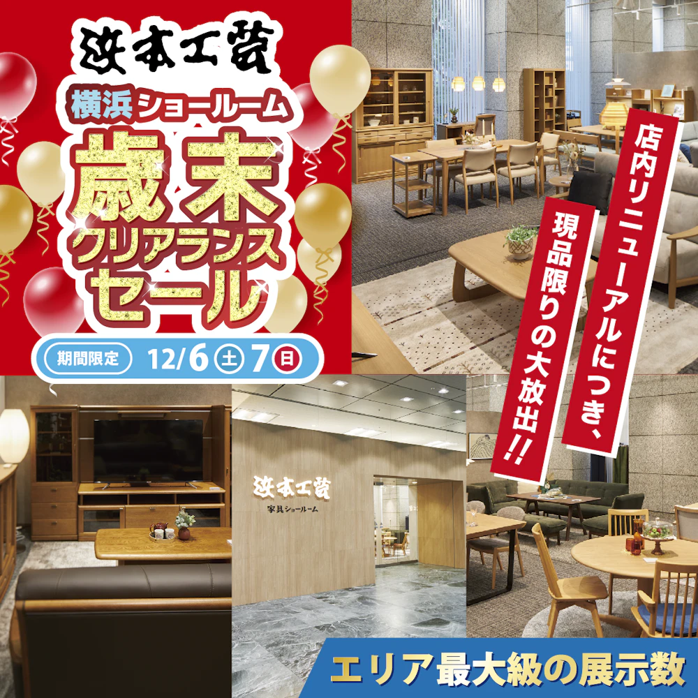 神奈川県横浜市保土ヶ谷区にある「横浜ビジネスパーク サウスタワー1階」の「浜本工芸 横浜ショールーム」にて、創業約100年目の老舗家具屋 亀屋家具が『歳末クリアランスセール』を期間限定にて開催!浜本工芸すべてのリビング・ダイニング・デスクなどの浜本工芸公式カタログ・ホームページ掲載品をすべて期間限定イベントの特別価格にてご提供!