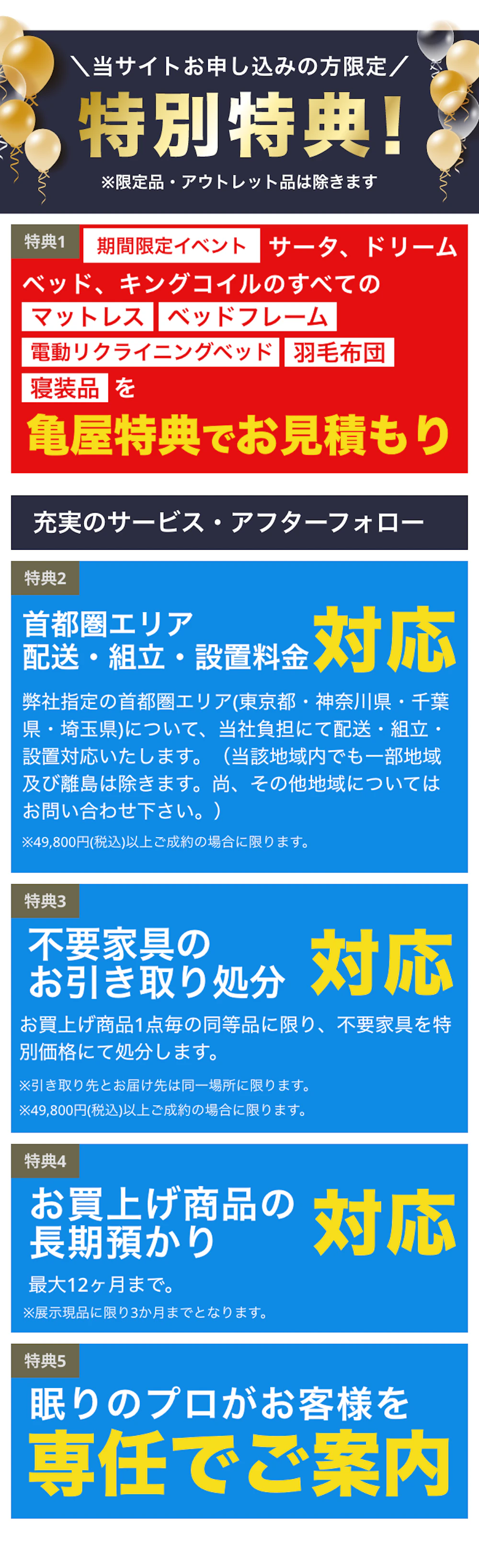 | 不用品のお引き取り | 特別価格にて承ります。 ※お買上げ商品1点毎の同等品、また引き取り先とお届け先は同一場所に限ります。 ※49,800円(税込)以上ご成約の場合に限ります。 |