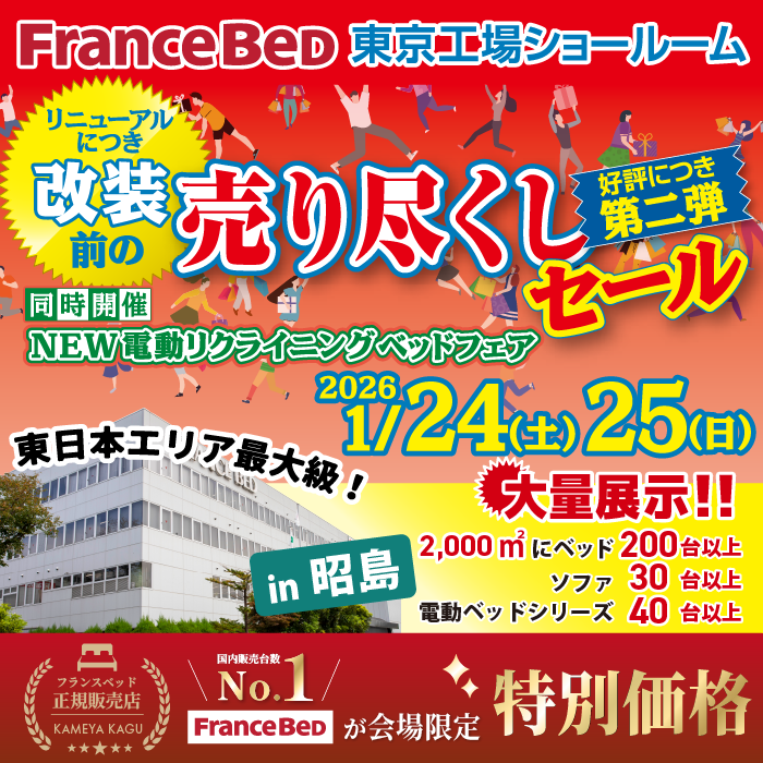 | 開催場所 | フランスベッド東京工場ショールーム (〒196-0022 東京都昭島市中神町1148) |
