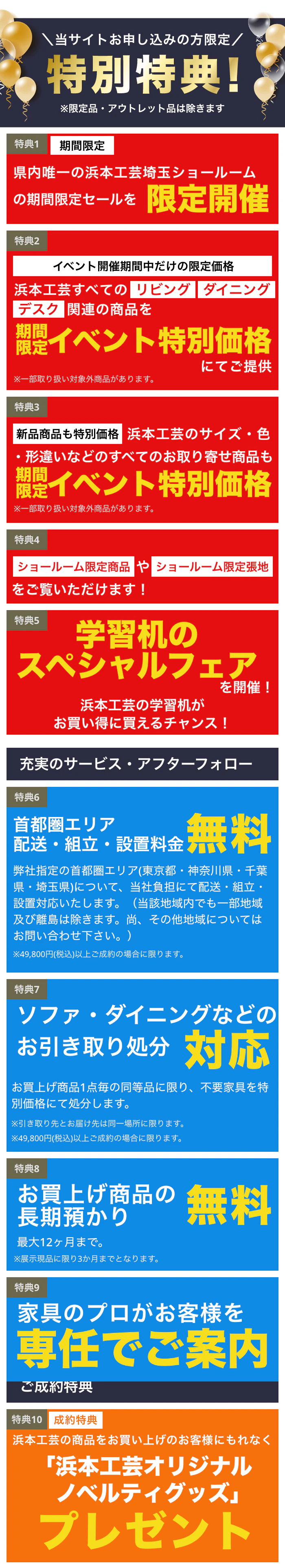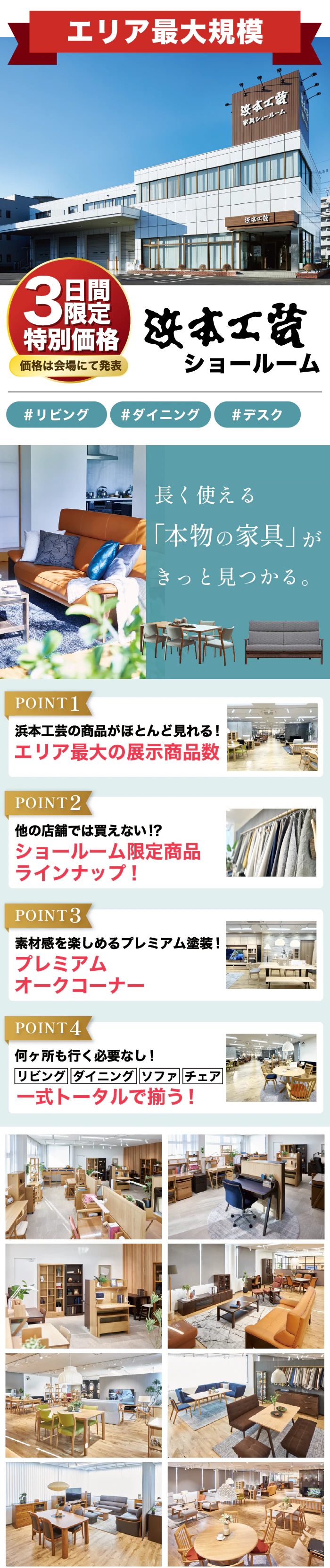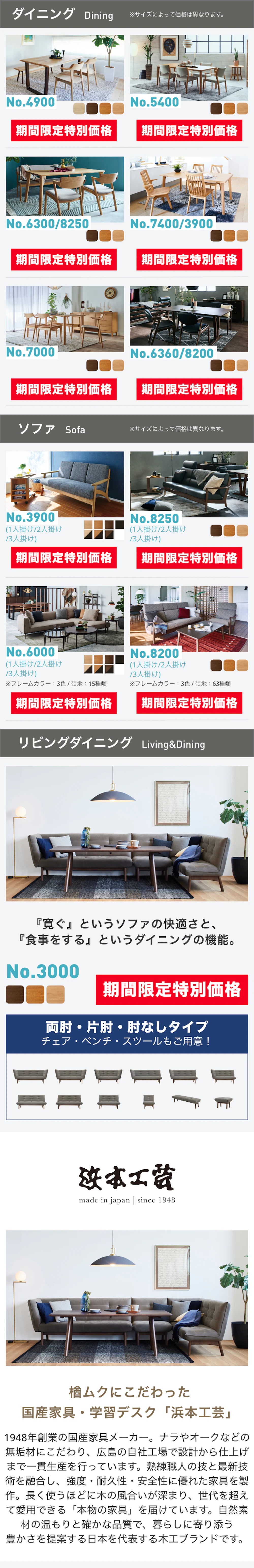 浜本工芸のダイニングテーブル・チェア、リビングソファ、学習デスクなどの浜本工芸公式カタログ・ホームページ掲載品をすべて特別イベント限定の特別価格にてご提供!