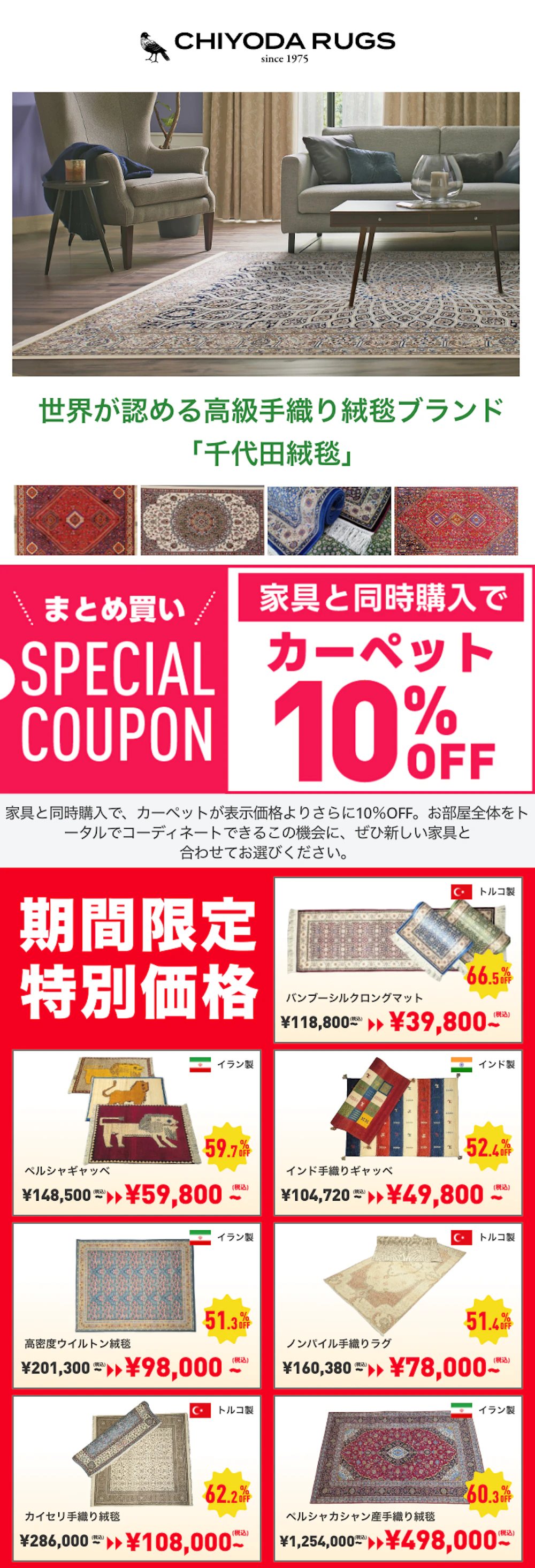 家具と同時購入で、カーペットが表示価格よりさらに10%OFF。 お部屋全体をトータルでコーディネートできるこの機会に、ぜひ新しい家具と合わせてお選びください。 ※特価品は対象外です。