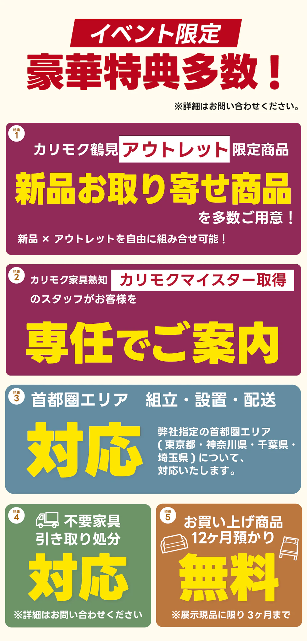 | 開催場所 | 〒230-0064 神奈川県横浜市鶴見区小野町41-1 カリモク鶴見アウトレット |