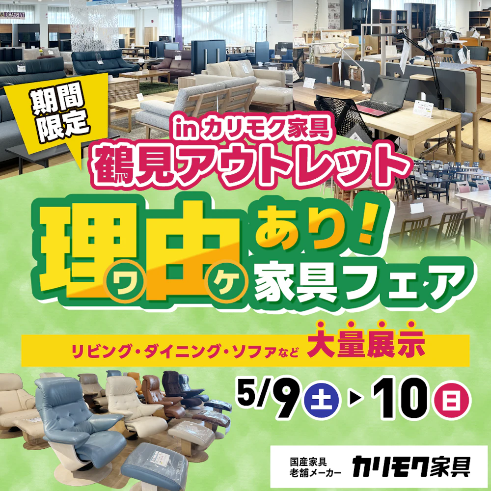 | 開催場所 | 〒230-0064 神奈川県横浜市鶴見区小野町41-1 カリモク家具鶴見アウトレット |