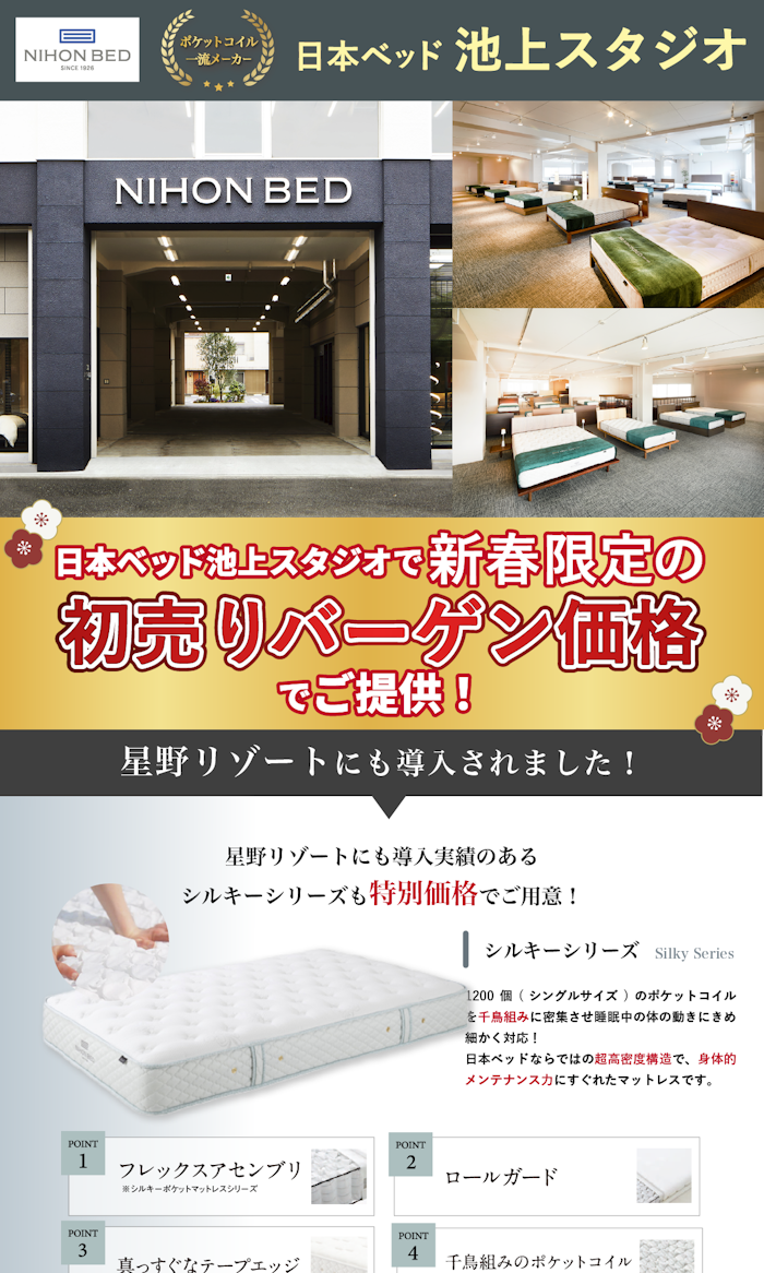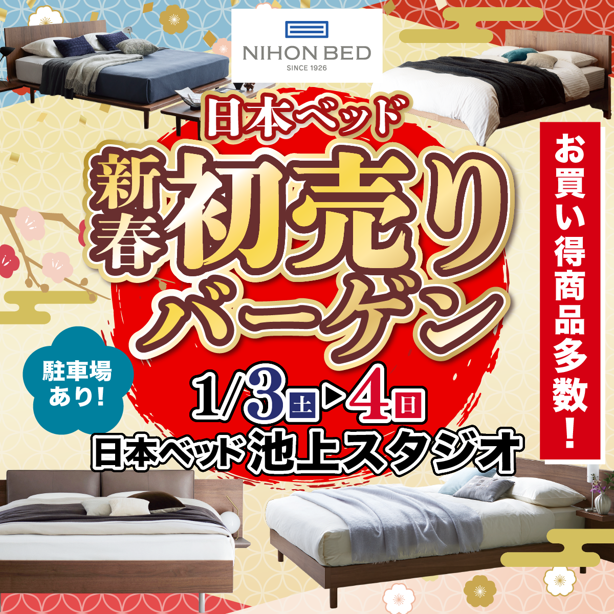 東京都大田区池上にある「日本ベッド 池上スタジオ」にて、創業約100年の亀屋家具が『日本ベッド 新春初売りバーゲン』を期間限定にて開催!