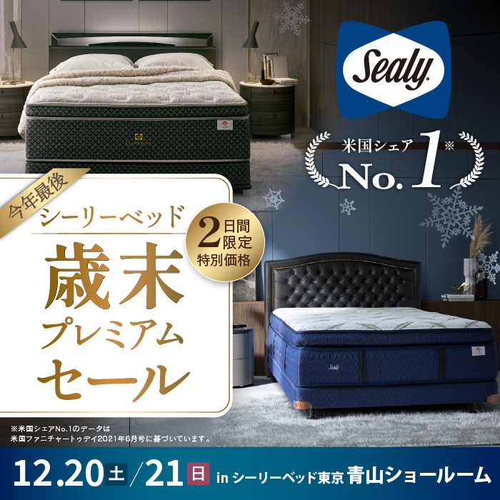 東京都港区北青山にある「Sealy Bed 東京ショールーム(青山)」にある特設会場にて、創業約100年の老舗家具屋 亀屋家具が『シーリーベッド 歳末プレミアムセール』を期間限定にて開催!