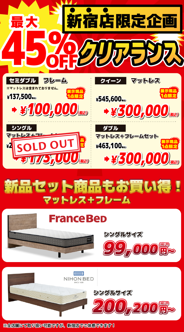 一流ベッドブランドのすべてのマットレス・ベッドフレーム・電動リクライニングベッド・羽毛布団・寝装品を「特別価格」にてご提供!