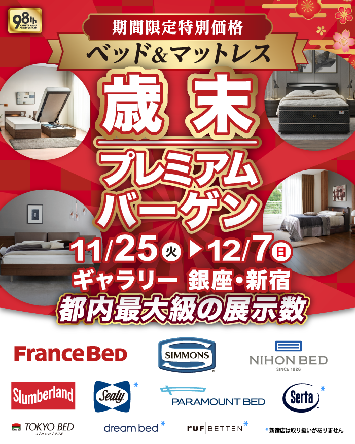 一流ベッドブランドのすべてのマットレス・ベッドフレーム・電動リクライニングベッド・羽毛布団・寝装品を「特別価格」にてご提供!