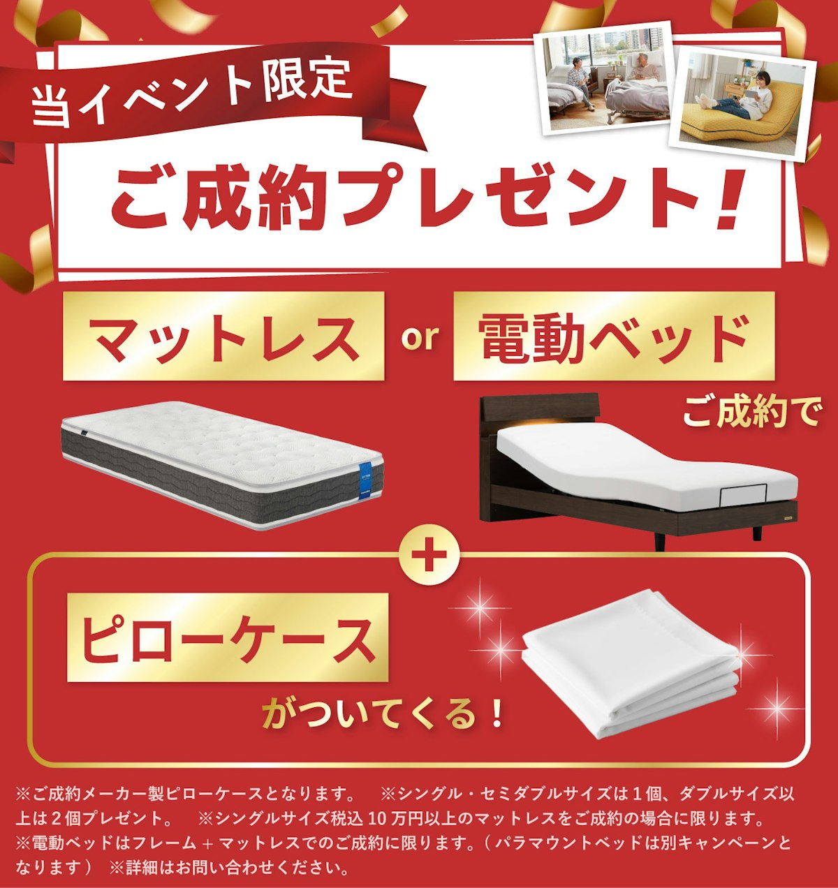 「パラマウントベッド」の電動リクライニングベッドご成約で、「ボックスシーツ or ピロー(枕)」プレゼント!