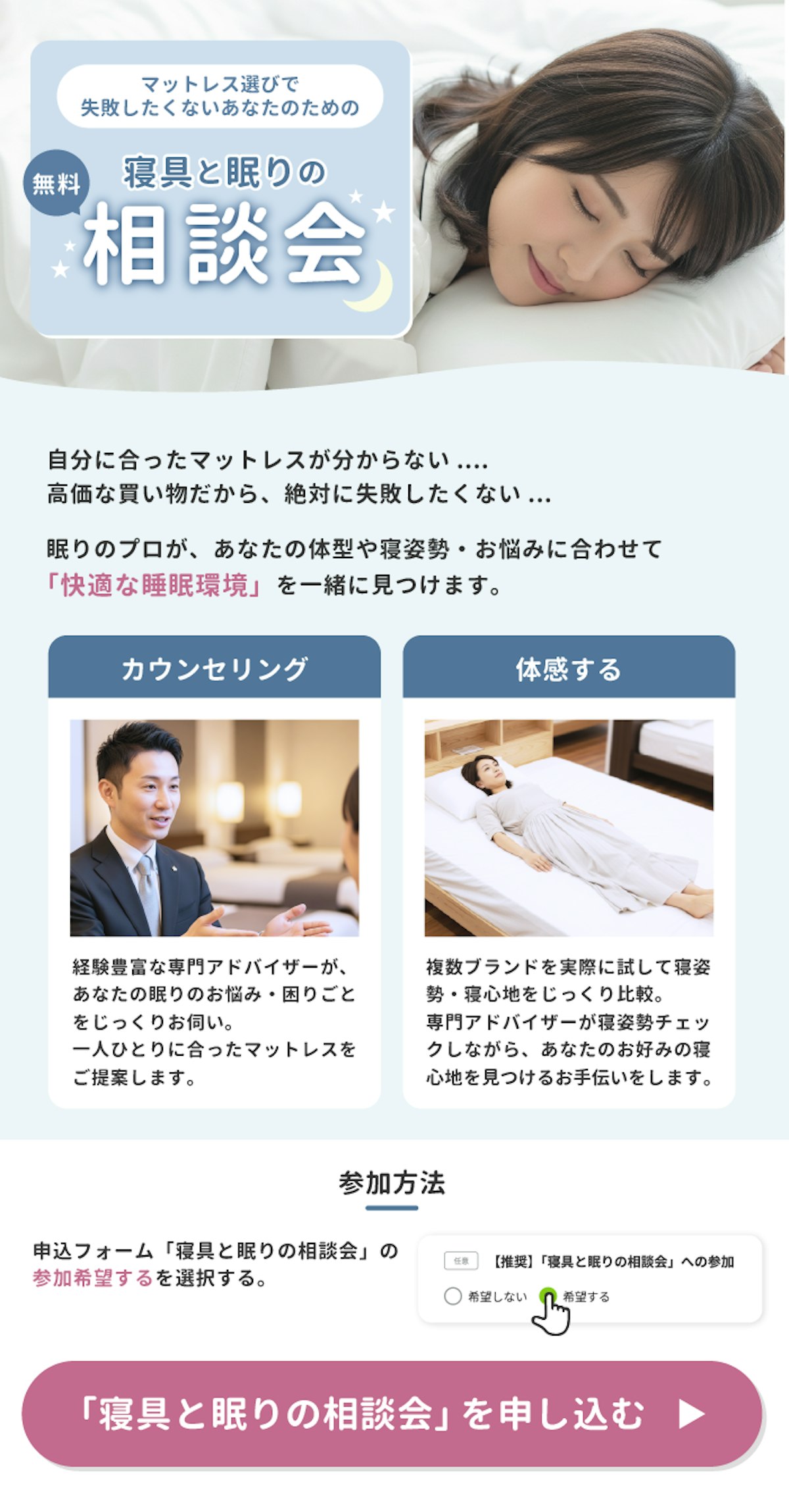 「スリープアドバイザー」や「電動ベッドアドバイザー」を保有している眠りのプロがお客様を専任でご案内させていただきます。