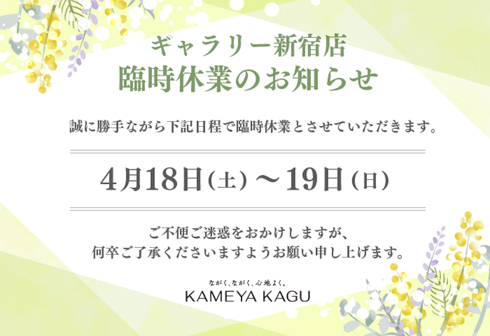 | 開催日 | 04月13日(月) ~ 04月30日(木) ※ギャラリー新宿店は 04/17(金)と04/18(土)はお休みです |