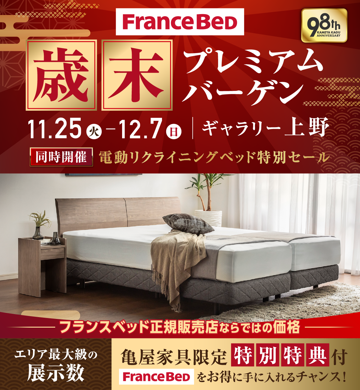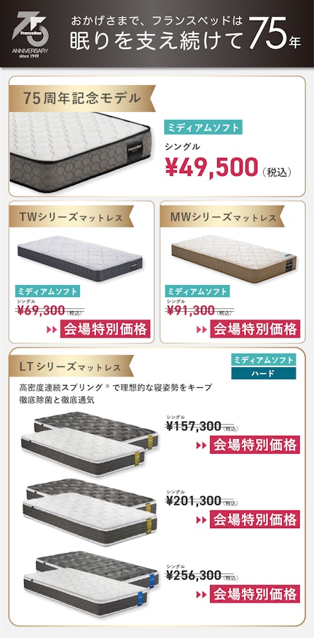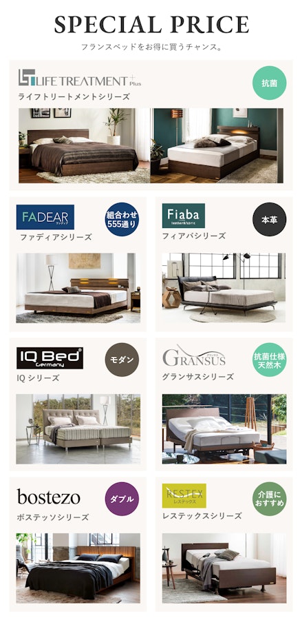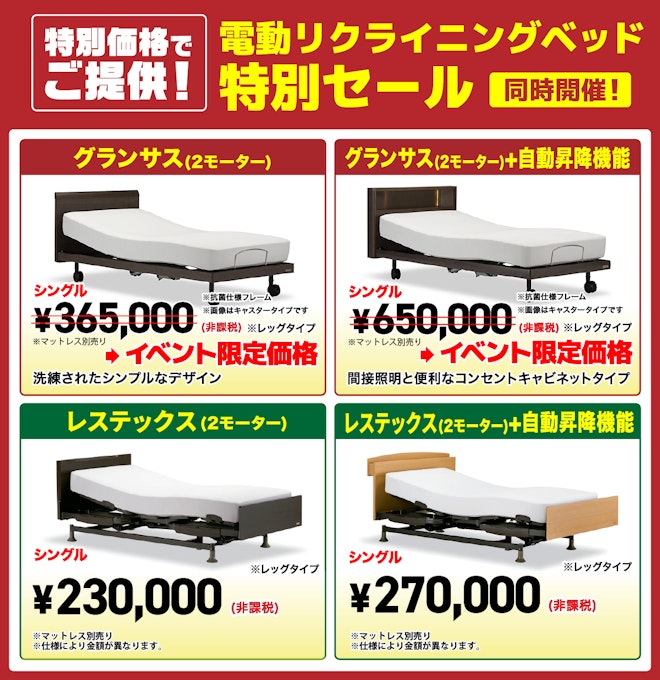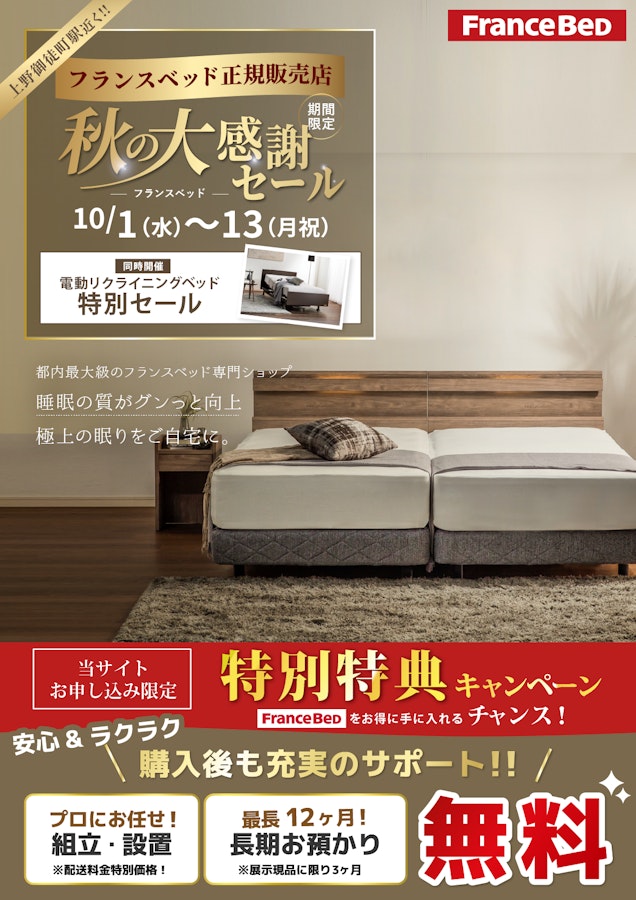 フランスベッドのすべてのマットレス・ベッドフレーム・電動リクライニングベッド・羽毛布団・寝装品を「特別価格」にてご提供!