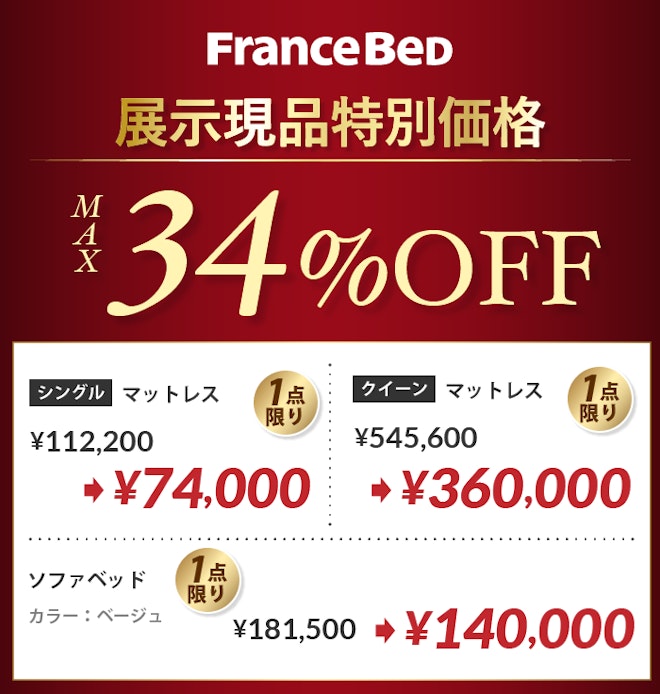 ※シングルサイズ税込10万円以上のフランスベッドマットレスをご成約の場合に限ります。