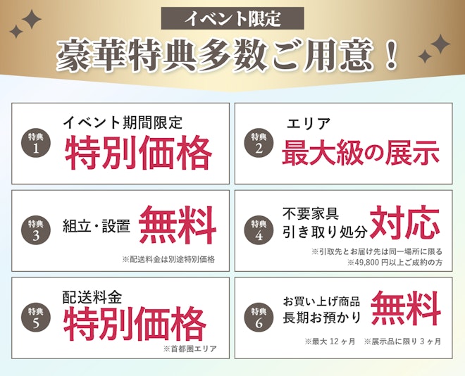 不用品のお引き取り | 特別価格にて承ります。 ※お買上げ商品1点毎の同等品に限り、不要家具を特別価格にて処分します。 ※引き取り先とお届け先は同一場所に限ります。 ※49,800円以上のマットレス・ベッドフレームご成約の場合に限ります。 |
