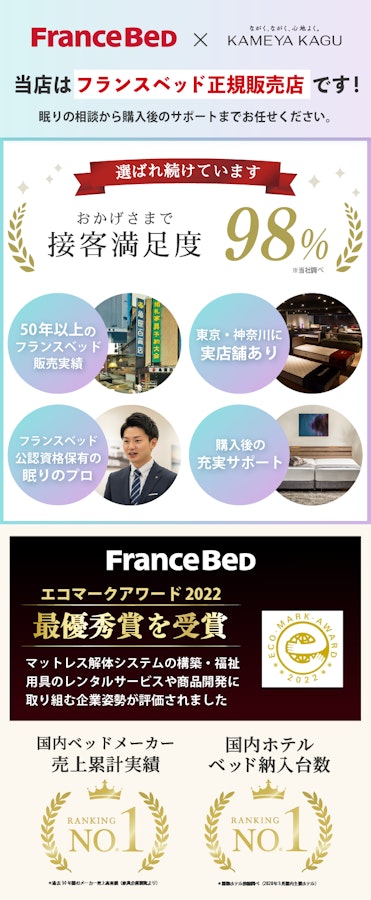 フランスベッド公認資格「スリープアドバイザー」や「電動ベッドアドバイザー」を保有している眠りのプロがお客様を専任でご案内させていただきます。