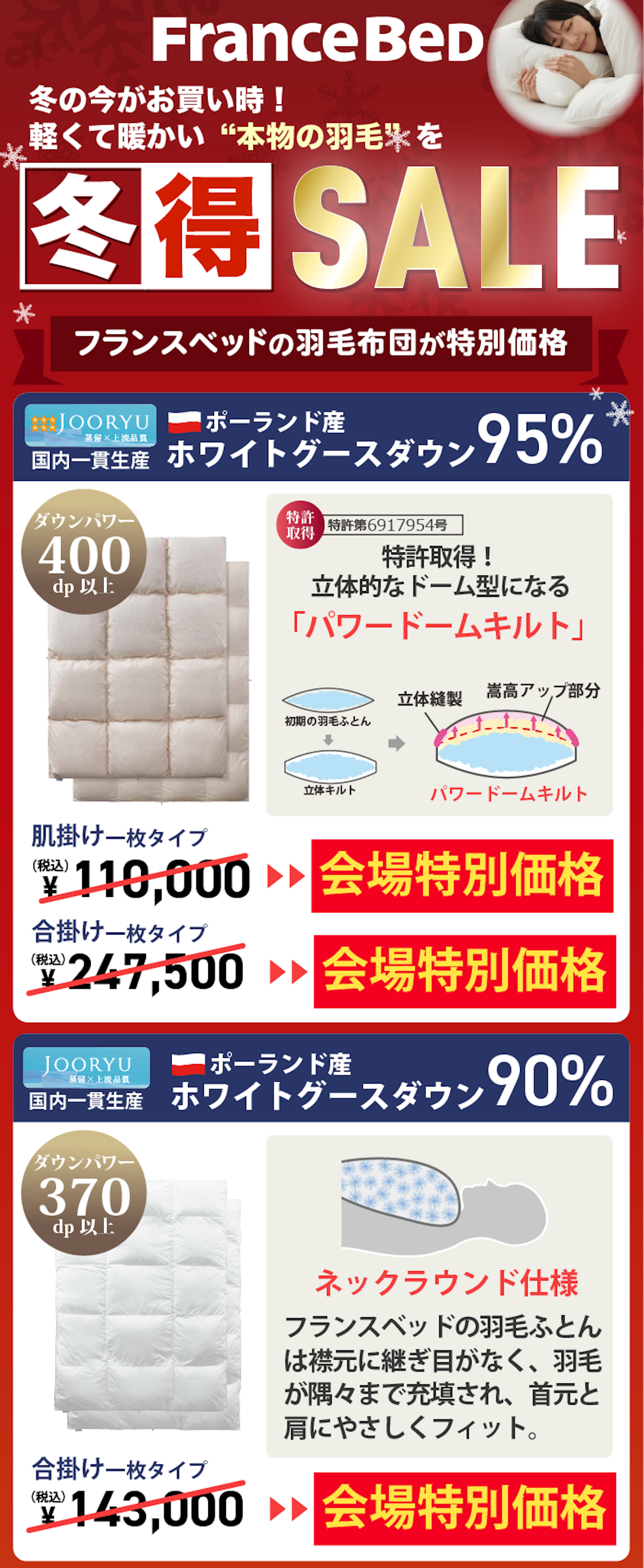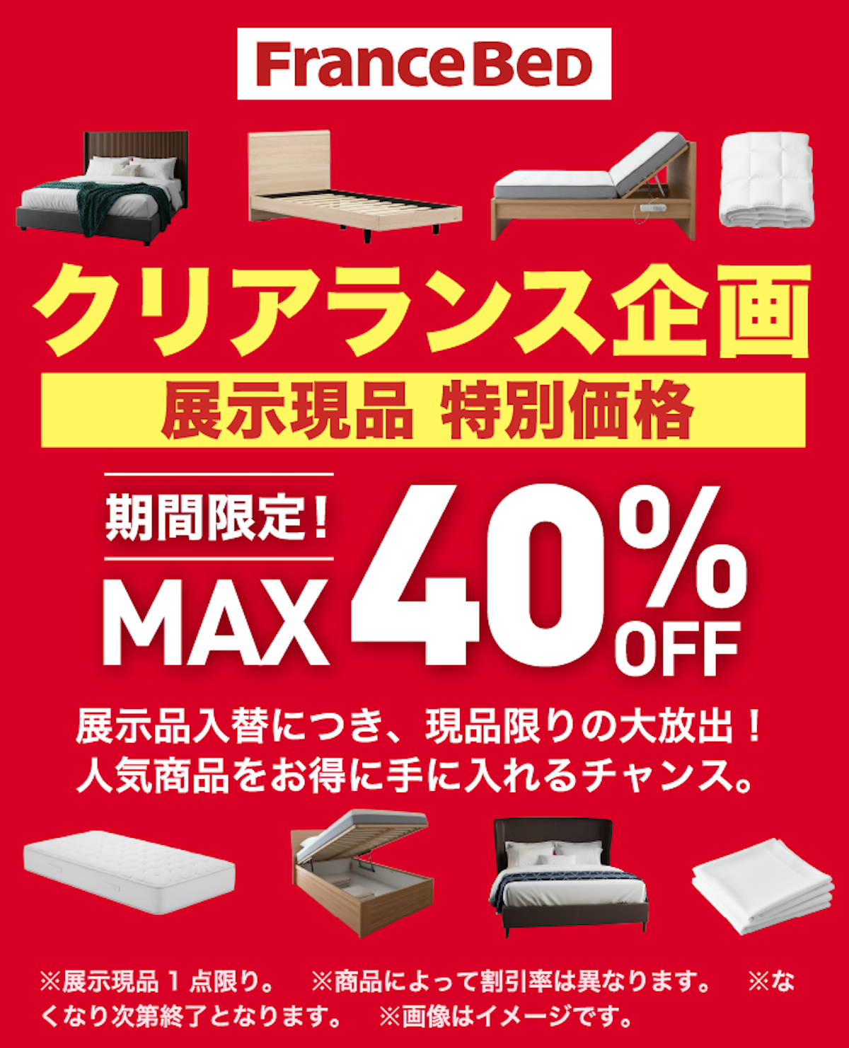 展示現品だけでなく、フランスベッドのすべてのマットレス・ベッドフレーム・電動リクライニングベッド・羽毛布団・寝装品を「特別価格」にてご提供!