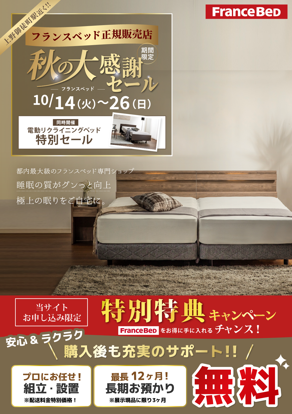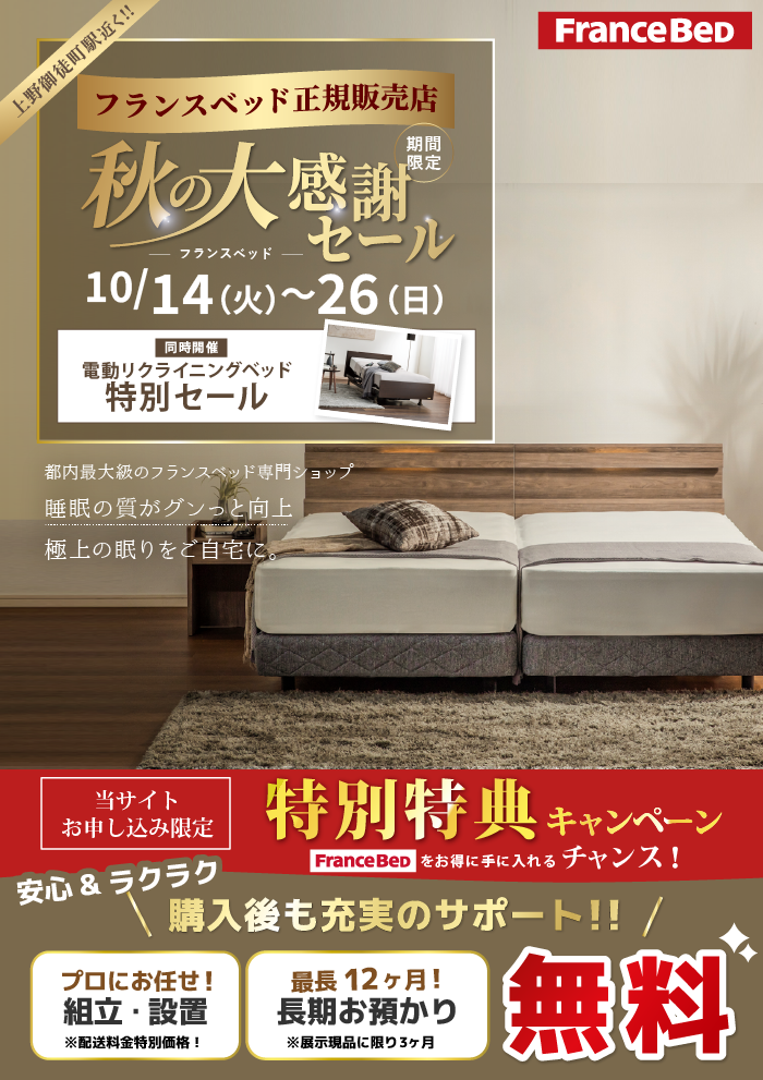 フランスベッドのすべてのマットレス・ベッドフレーム・電動リクライニングベッド・羽毛布団・寝装品を「特別価格」にてご提供!