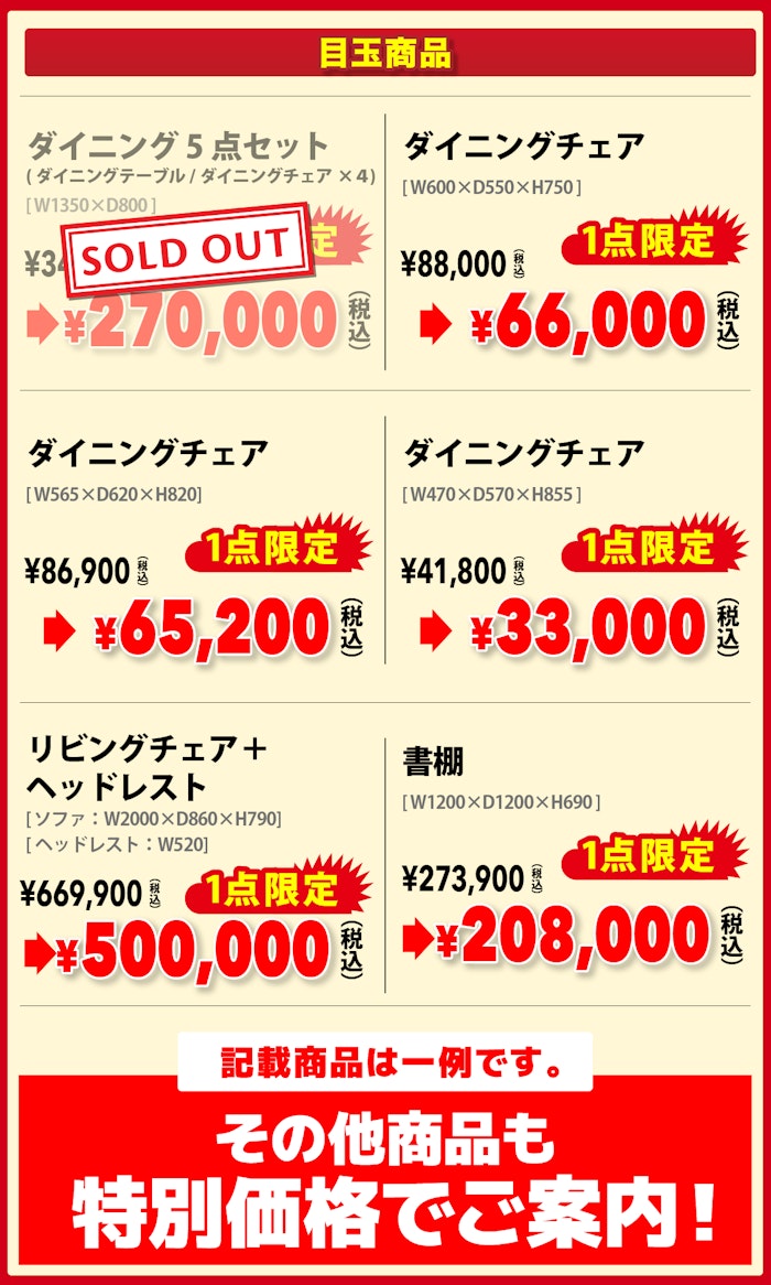 お買上げ商品1点毎の同等品に限り、不要家具を特別価格にて処分します。