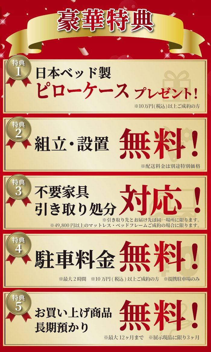 不用品のお引き取り | 特別価格にて承ります。 ※お買上げ商品1点毎の同等品に限り、不要家具を特別価格にて処分します。 ※引き取り先とお届け先は同一場所に限ります。 ※49,800円以上のマットレス・ベッドフレームご成約の場合に限ります。 |