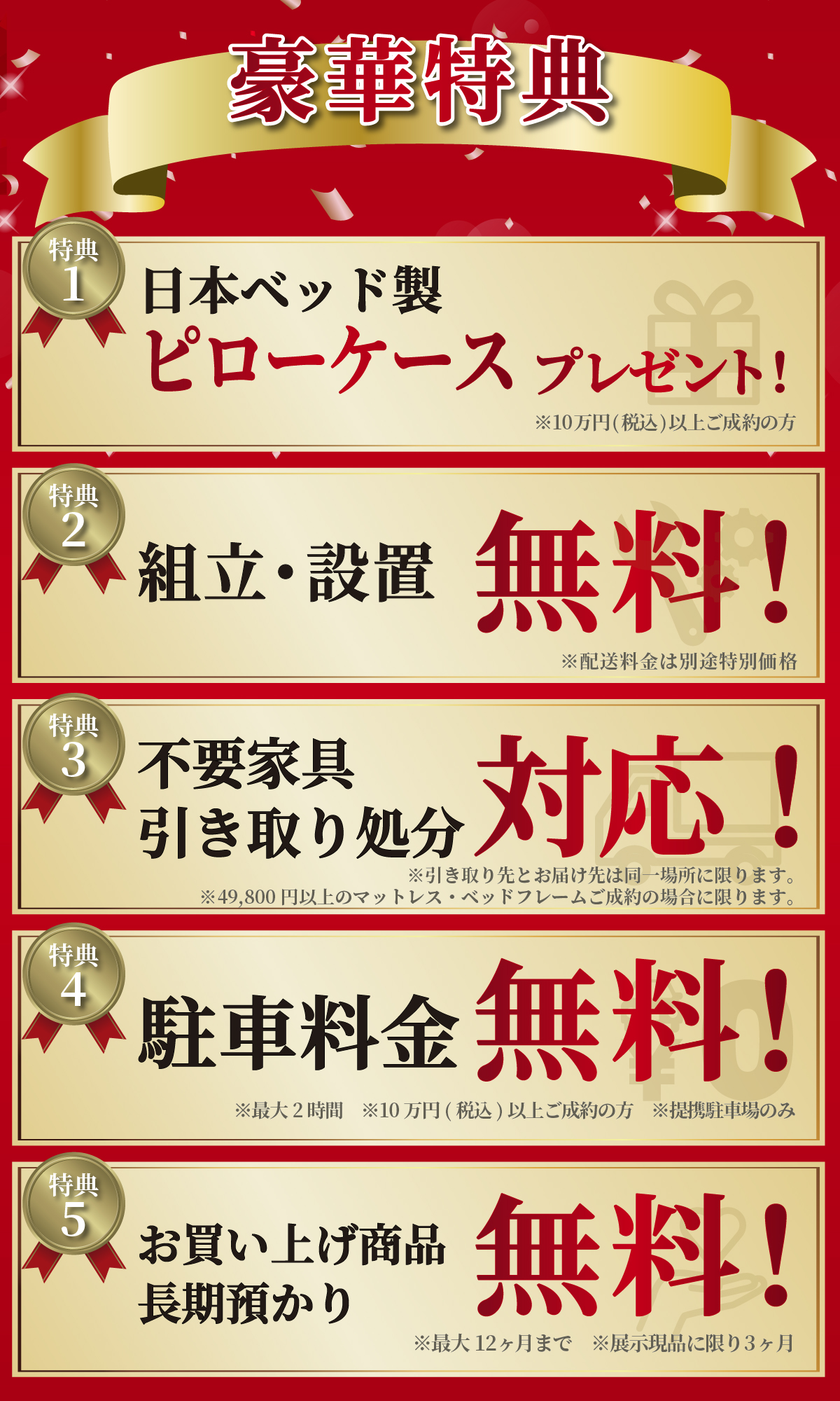 | 不用品のお引き取り | 特別価格にて承ります。 ※お買上げ商品1点毎の同等品に限り、不要家具を特別価格にて処分します。 ※引き取り先とお届け先は同一場所に限ります。 ※49,800円以上のマットレス・ベッドフレームご成約の場合に限ります。 |