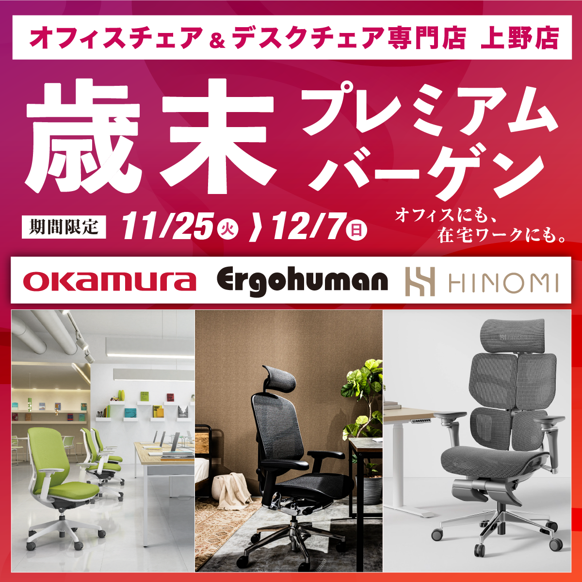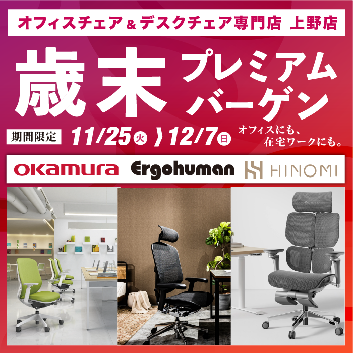 オフィスチェア人気ブランド「エルゴヒューマン」「オカムラ」「HINOMI」をイベント限定の特別価格にてご提供!