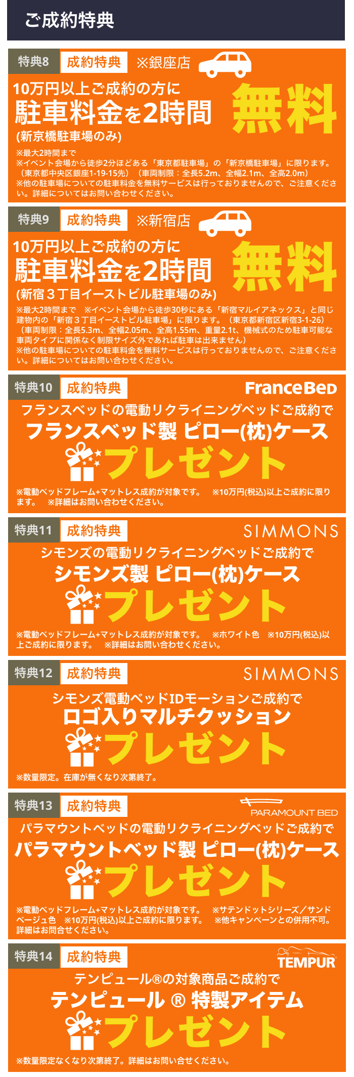 | 専用駐車場 | ギャラリー銀座店 「新京橋駐車場」に限り、10万円以上ご成約の方に駐車料金を無料サービス致します。 ※最大2時間まで ※イベント会場から徒歩2分ほどにある「東京都駐車場」の「新京橋駐車場」に限ります。(東京都中央区銀座1丁目19−15先) (車両制限:全長5.2m、全幅2.1m、全高2.0m) ※他の駐車場についての駐車料金を無料サービスは行っておりませんので、ご注意ください。詳細についてはお問い合わせください。 ------------------------------------------------------------ ギャラリー新宿店 「新宿3丁目イーストビル駐車場」に限り、10万円以上ご成約の方に駐車料金を無料サービス致します。 ※最大2時間まで ※イベント会場から徒歩30秒にある「新宿マルイアネックス」と同じ建物内の「新宿3丁目イーストビル駐車場」に限ります。(東京都新宿区新宿3-1-26) (車両制限:全長5.3m、全幅2.05m、全高1.55m、重量2.1t、機械式のため駐車可能な車両タイプに関係なく制限サイズ外であれば駐車は出来ません) ※他の駐車場についての駐車料金を無料サービスは行っておりませんので、ご注意ください。詳細についてはお問い合わせください。 |