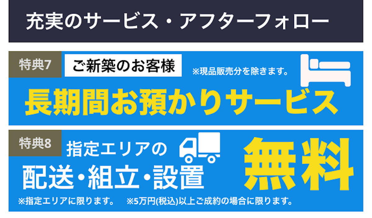 | 不用品のお引き取り | 特別価格にて承ります。 ※お買上げ商品1点毎の同等品、また引き取り先とお届け先は同一場所に限ります。 ※49,800円(税込)以上ご成約の場合に限ります。 |