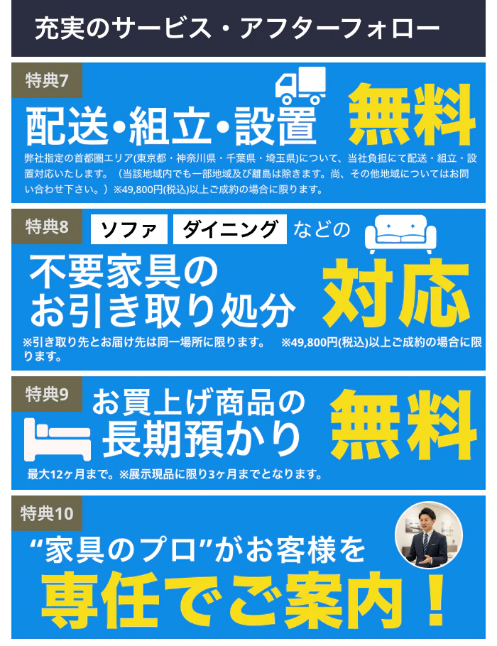 | 不用品のお引き取り | 特別価格にて承ります。 ※お買上げ商品1点毎の同等品、また引き取り先とお届け先は同一場所に限ります。 ※49,800円(税込)以上ご成約の場合に限ります。 |