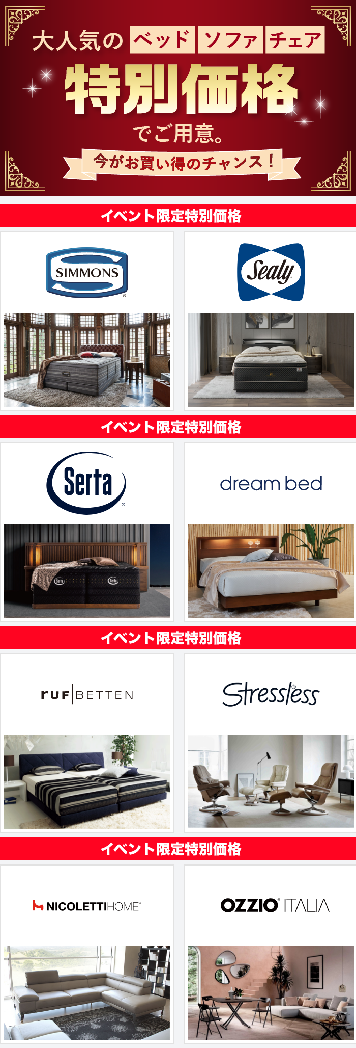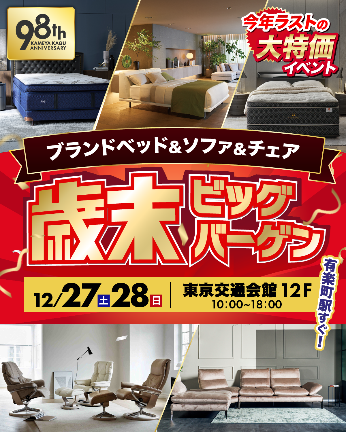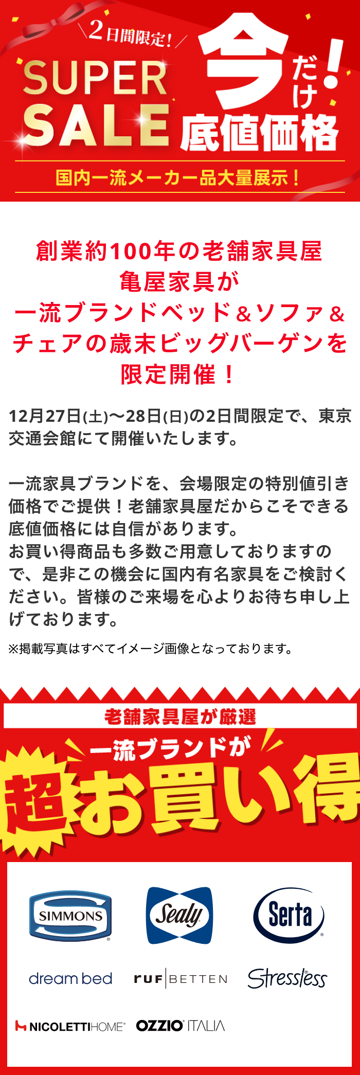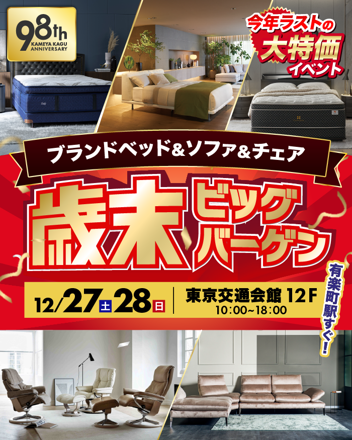 創業約100年の老舗家具屋 亀屋家具が一流ブランドベッド&ソファ&チェアの歳末ビッグバーゲンを限定開催!