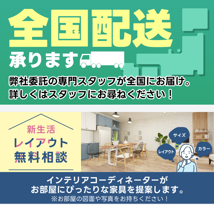 | 組立・設置 | 無料にて承ります。 ※50,000円(税込)以上ご成約の場合に限ります。 ※弊社指定の首都圏エリア(東京都・神奈川県・千葉県・埼玉県)限定 (上記首都圏エリア内でも一部地域、及び離島は除きます。尚、その他地域については、お問い合わせ下さい。) |