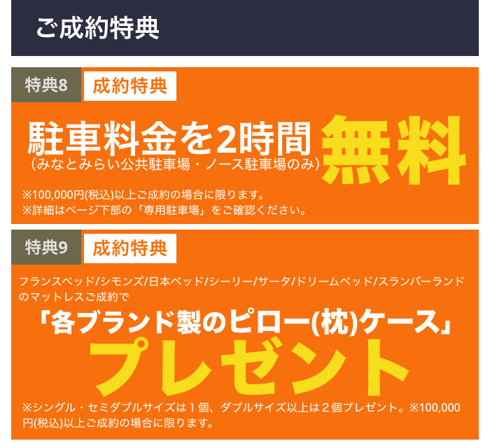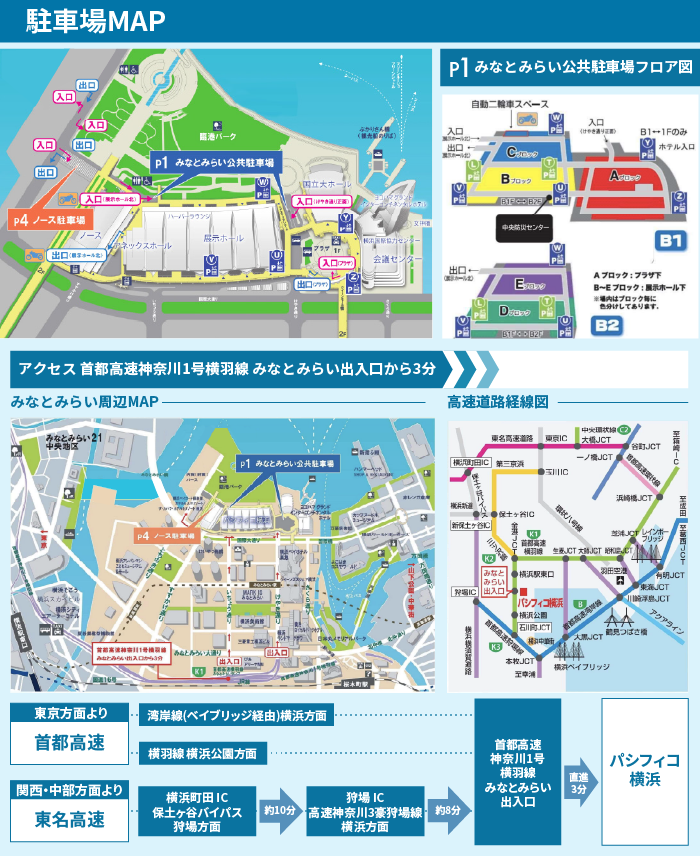 | 専用駐車場 | 「みなとみらい公共駐車場・ノース駐車場」に限り、税込10万円以上ご成約の方に、駐車料金を最大2時間無料サービス致します。 ※イベント会場「パシフィコ横浜」近隣にある「みなとみらい公共駐車場・ノース駐車場」に限ります。 (■みなとみらい公共駐車場/車両制限:高さ2.1m 長さ:6.0m 幅:2.2m ■ノース駐車場/車両制限:高さ2.3m 長さ:5.0m 幅:2.3m) ※他の駐車場についての駐車料金を無料サービスは行っておりませんので、ご注意ください。詳細についてはお問い合わせください。 |