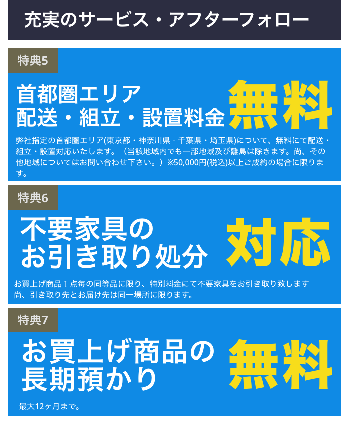 | 不用品のお引き取り | 特別価格にて承ります。 ※お買上げ商品1点毎の同等品、また引き取り先とお届け先は同一場所に限ります。 ※5万円(税込)以上ご成約の場合に限ります。 |