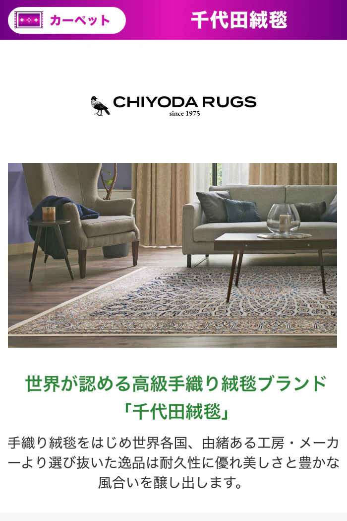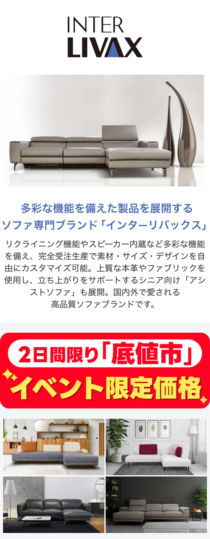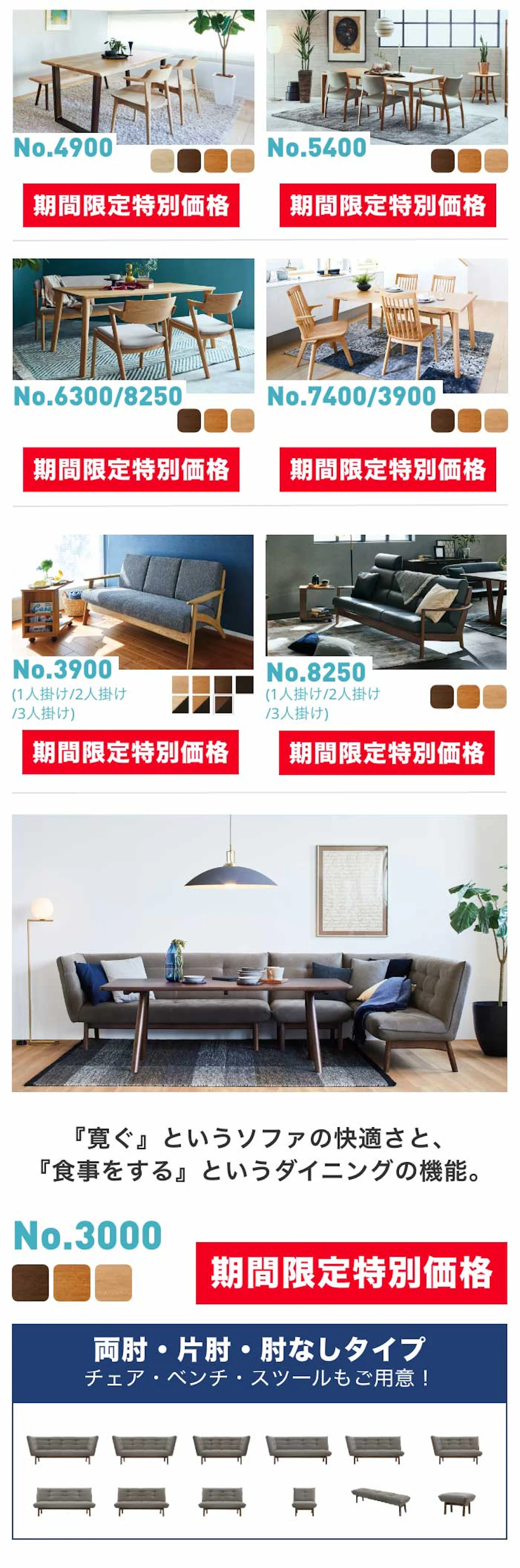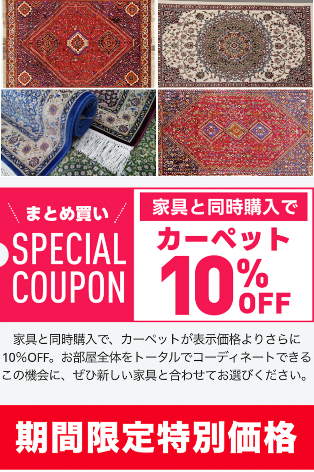 家具と同時購入で、カーペットが表示価格よりさらに10%OFF。 お部屋全体をトータルでコーディネートできるこの機会に、ぜひ新しい家具と合わせてお選びください。 ※特価品は対象外です。
