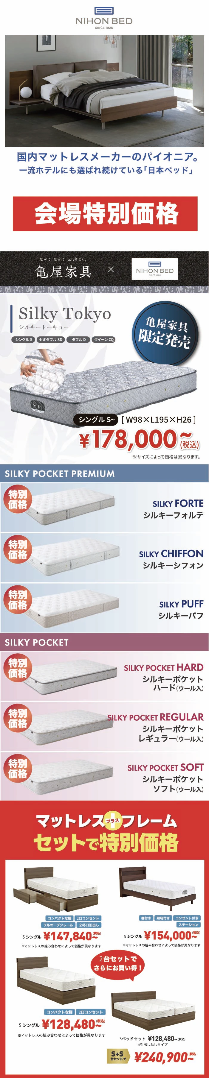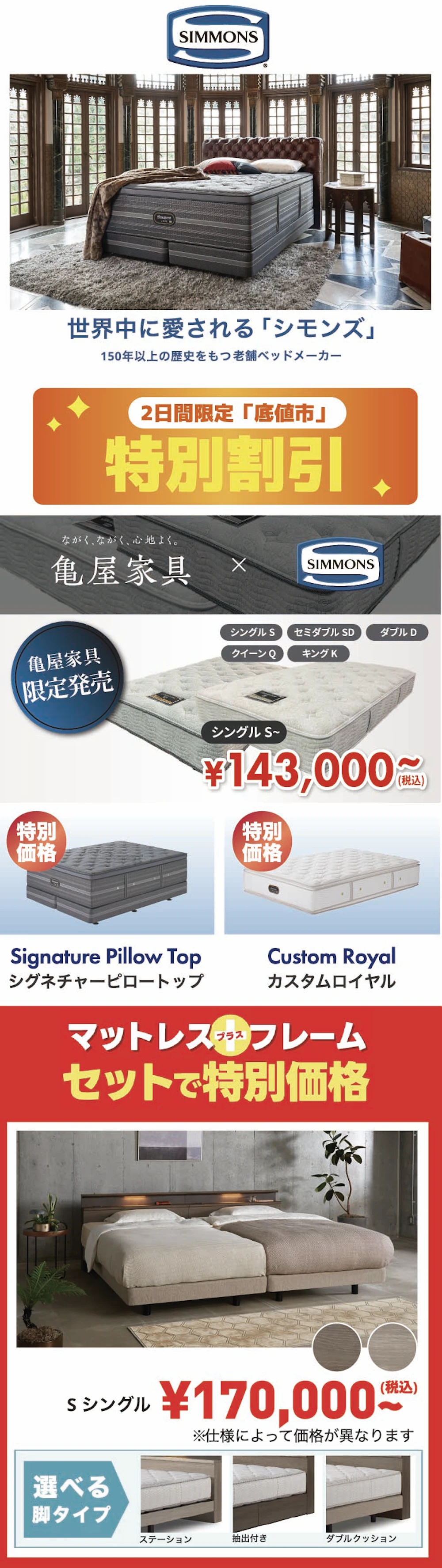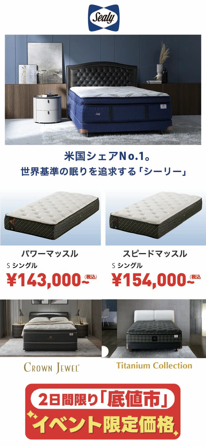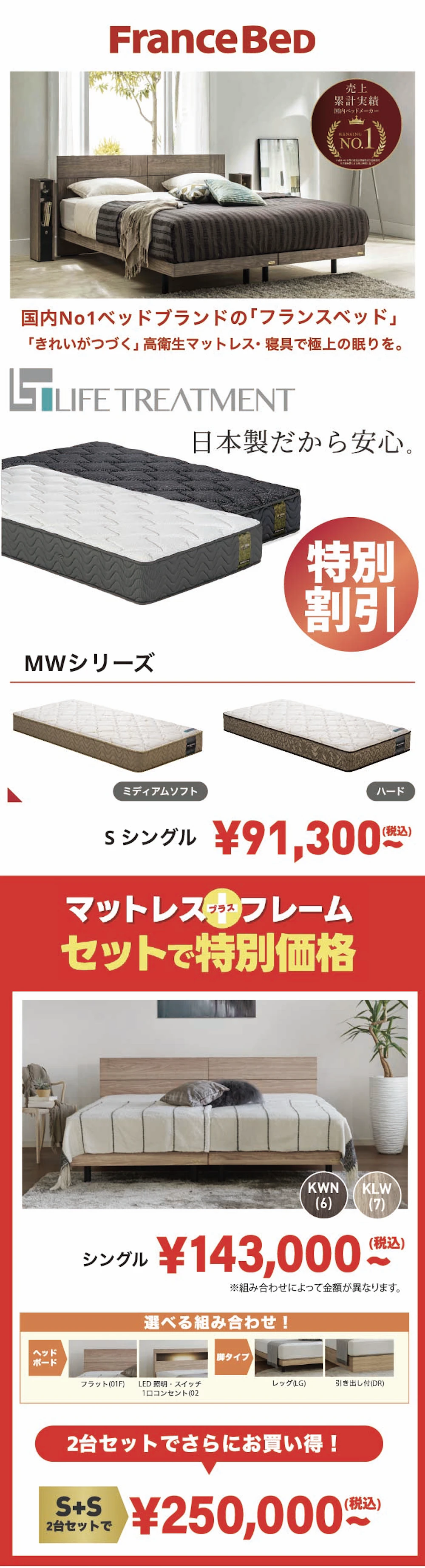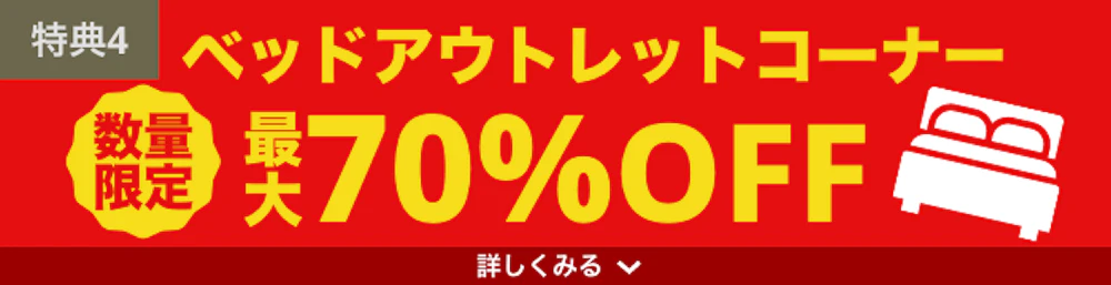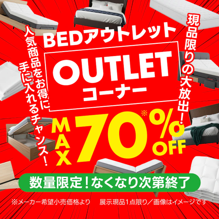 種類豊富なベッドアウトレットコーナーには、型落ち品・数量限定品・アウトレット品が勢揃い。国内外の有名ブランドベッドをお手頃価格でご提供しています。 ※特価品は対象外です。