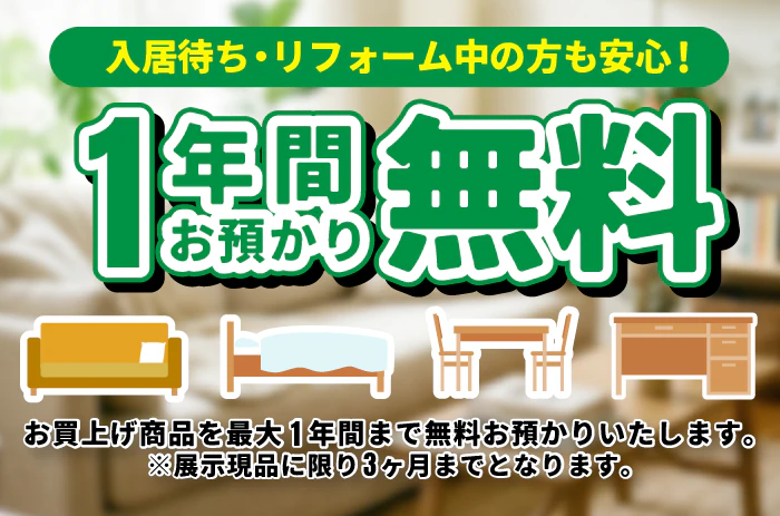 お買上げ商品を最大1年間まで無料お預かりいたします。 ※展示現品に限り3ヶ月までとなります。