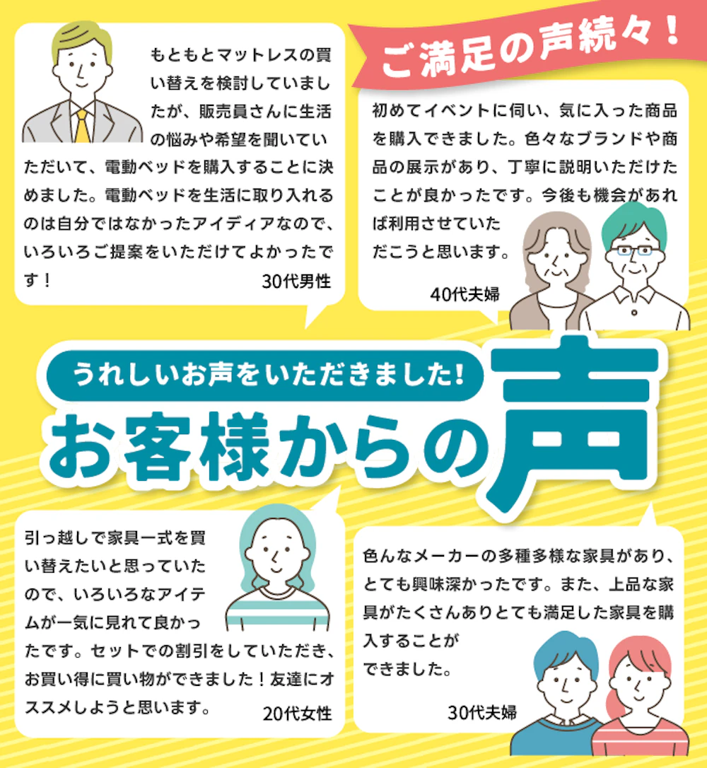 A 搬入経路のサイズ確認は事前にしっかり行うことが大切です。玄関・廊下・エレベーターなどの幅や高さをあらかじめご確認のうえ、会場内スタッフにお気軽にご相談ください。ご一緒に最適なサイズやプランをご提案いたします。
