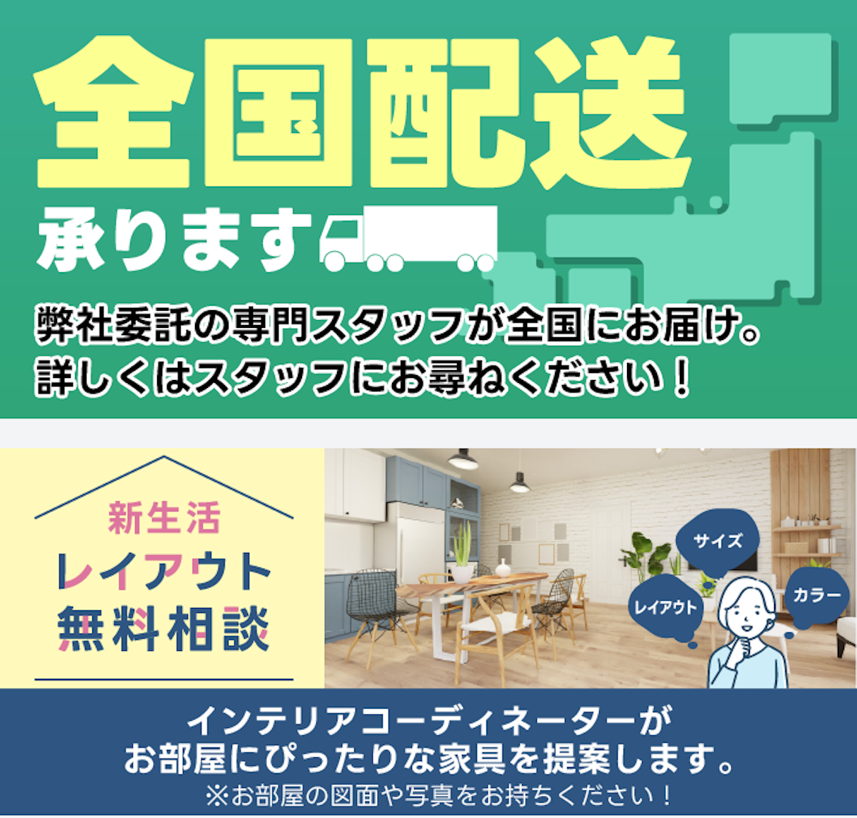 | 不用品のお引き取り | 特別価格にて承ります。 ※お買上げ商品1点毎の同等品、また引き取り先とお届け先は同一場所に限ります。 ※49,800円(税込)以上ご成約の場合に限ります。 |