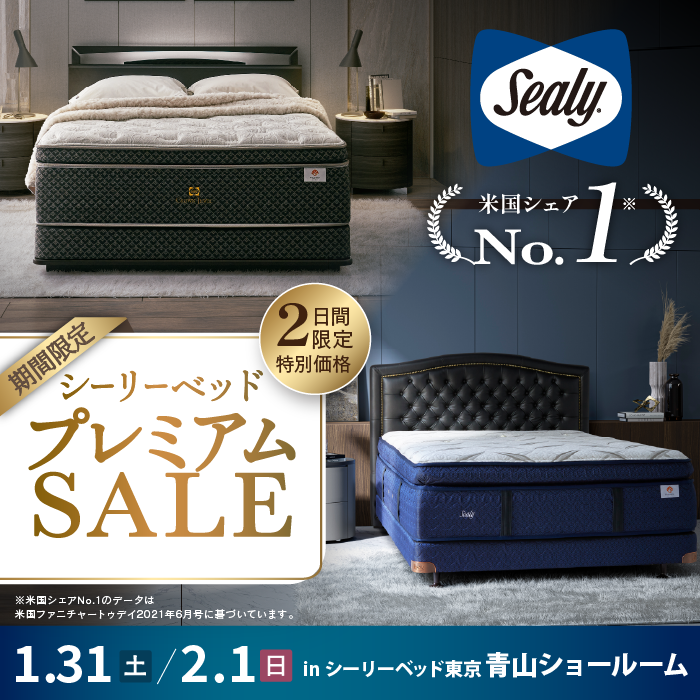 東京都港区北青山にある「Sealy Bed 東京ショールーム(青山)」にある特設会場にて、創業約100年の老舗家具屋 亀屋家具が『シーリーベッド プレミアムセール』を期間限定にて開催!