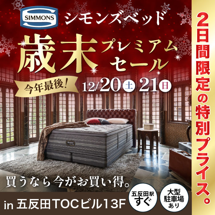 東京都品川区西五反田にある「TOCビル」にある特設会場にて、創業約100年の老舗家具屋 KAMEYA KAGUが『シモンズベッド 歳末プレミアムセール』を期間限定にて開催!