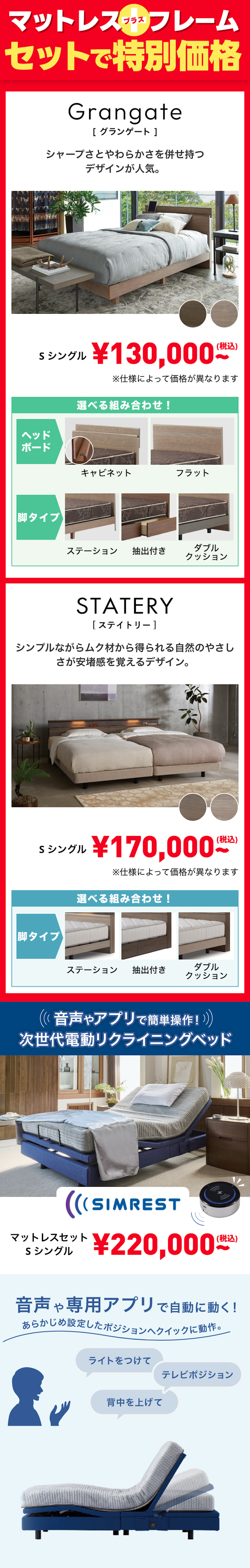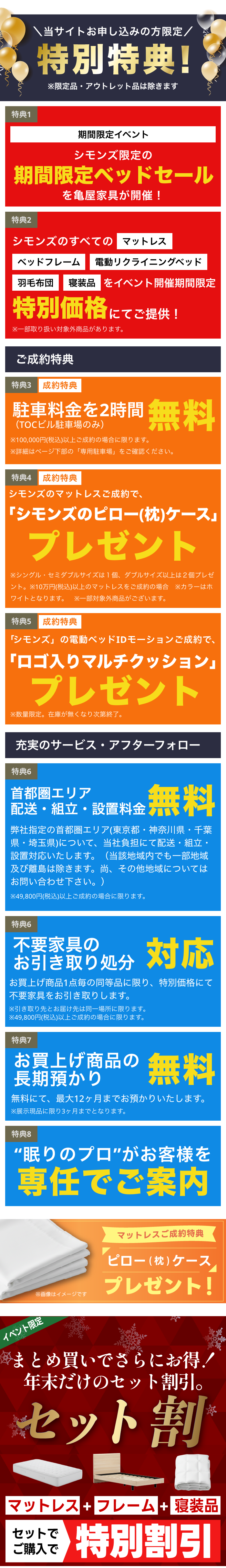 極上の眠りを実現する一流ブランドベッド「シモンズ」が誇る高品質・高機能マットレス、ベッドフレーム、高品質な羽毛ふとんや寝装品、安心・安全な電動リクライニングベッドなどなど、公式カタログ・ホームページ掲載品をすべて特別イベント限定価格にてご提供!