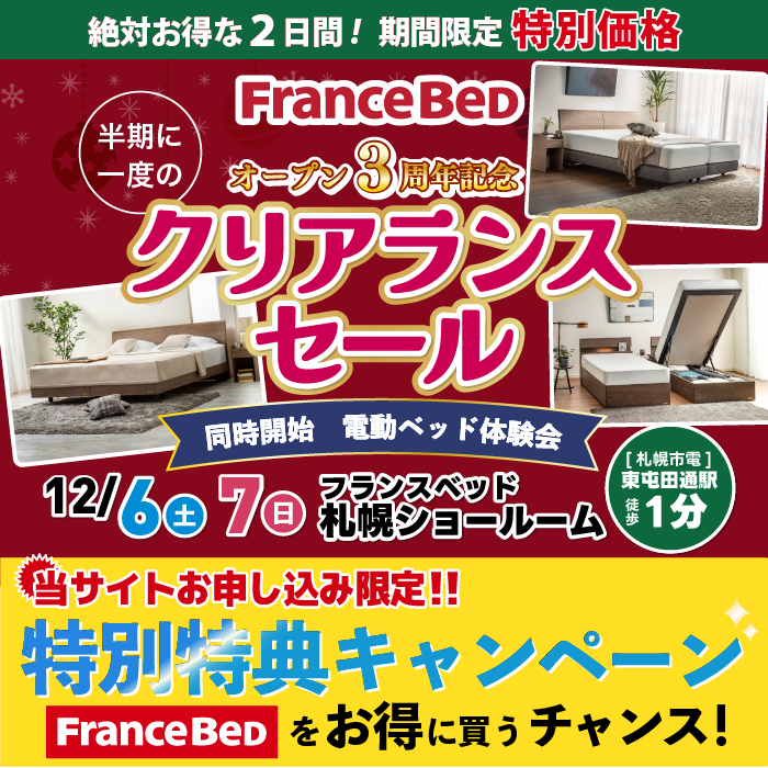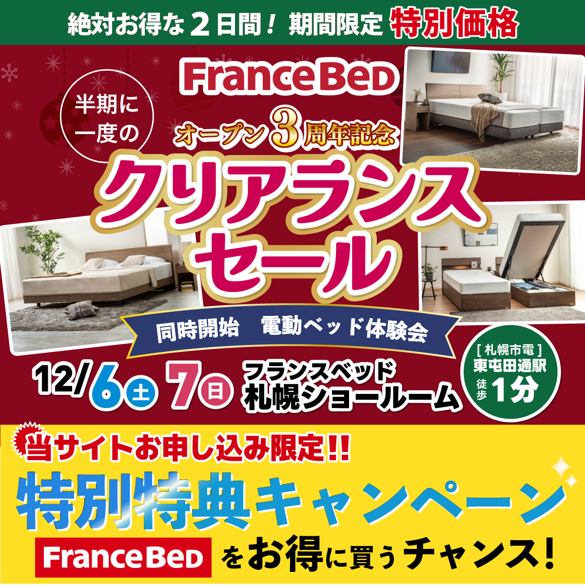 札幌市にある「フランスベッド札幌ショールーム」にて、2日間限定で『半期に一度のクリアランスセール オープン 3 周年記念』 を開催!また同時開催「電動ベッド体験会」も開催