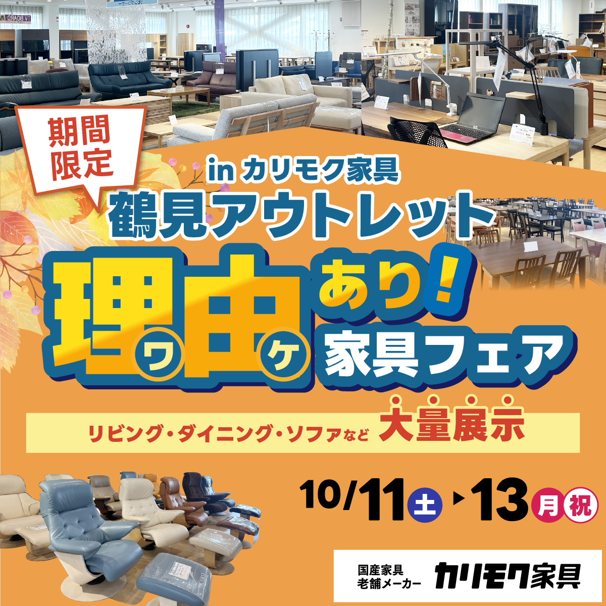 神奈川県横浜市鶴見にある「カリモク鶴見アウトレット」にて、『理由あり家具フェア』を期間限定で開催致します。
