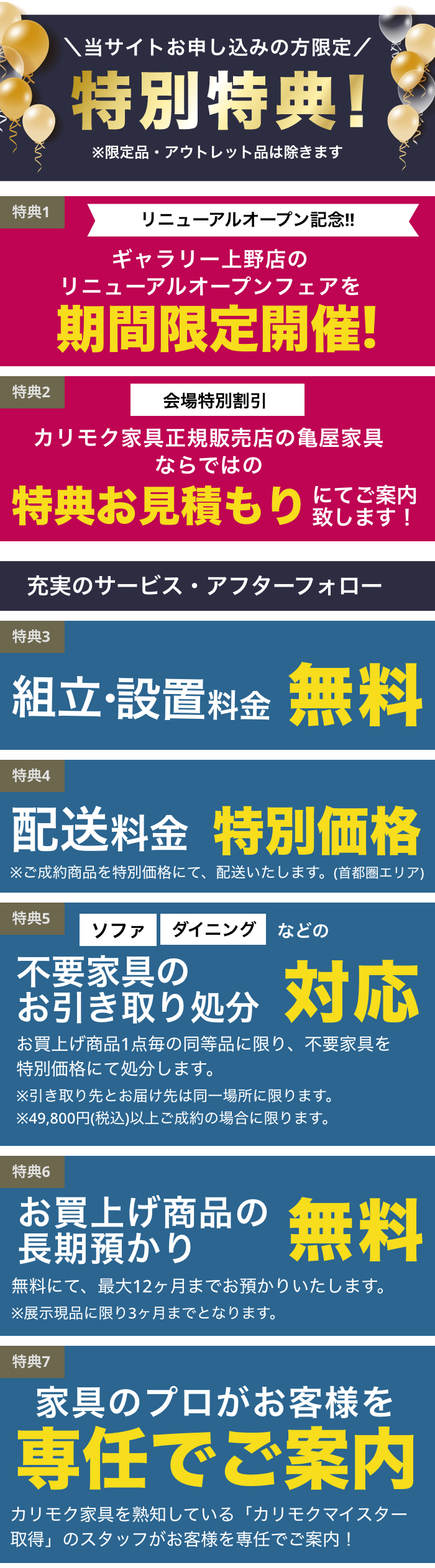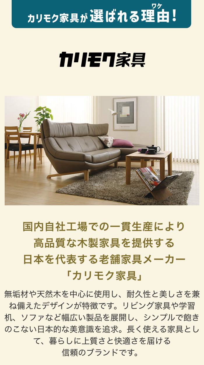 | 不用品のお引き取り | 特別価格にて承ります。 ※お買上げ商品1点毎の同等品、また引き取り先とお届け先は同一場所に限ります。 ※49,800円(税込)以上ご成約の場合に限ります。 |