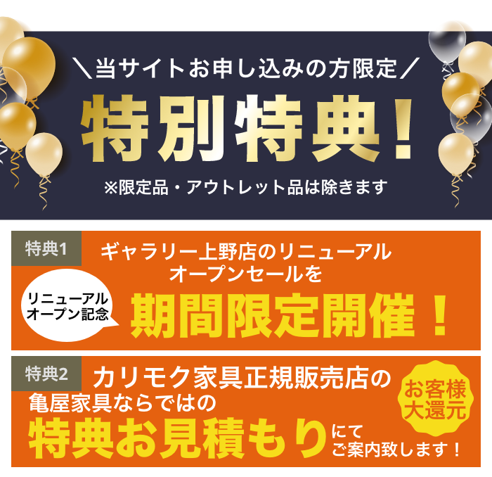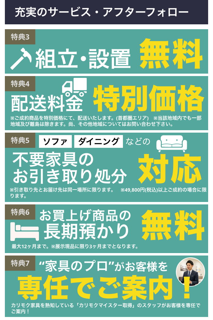 ※お買上げ商品1点毎の同等品に限り、不要家具を特別価格にて処分します。 ※引き取り先とお届け先は同一場所に限ります。 |