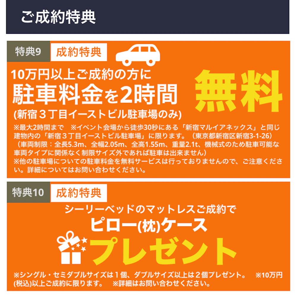 | 専用駐車場 | 「新宿3丁目イーストビル駐車場」に限り、10万円以上ご成約の方に駐車料金を無料サービス致します。 ※最大2時間まで ※イベント会場から徒歩30秒にある「新宿マルイアネックス」と同じ建物内の「新宿3丁目イーストビル駐車場」に限ります。(東京都新宿区新宿3-1-26) (車両制限:全長5.3m、全幅2.05m、全高1.55m、重量2.1t、機械式のため駐車可能な車両タイプに関係なく制限サイズ外であれば駐車は出来ません) ※他の駐車場についての駐車料金を無料サービスは行っておりませんので、ご注意ください。詳細についてはお問い合わせください。 |