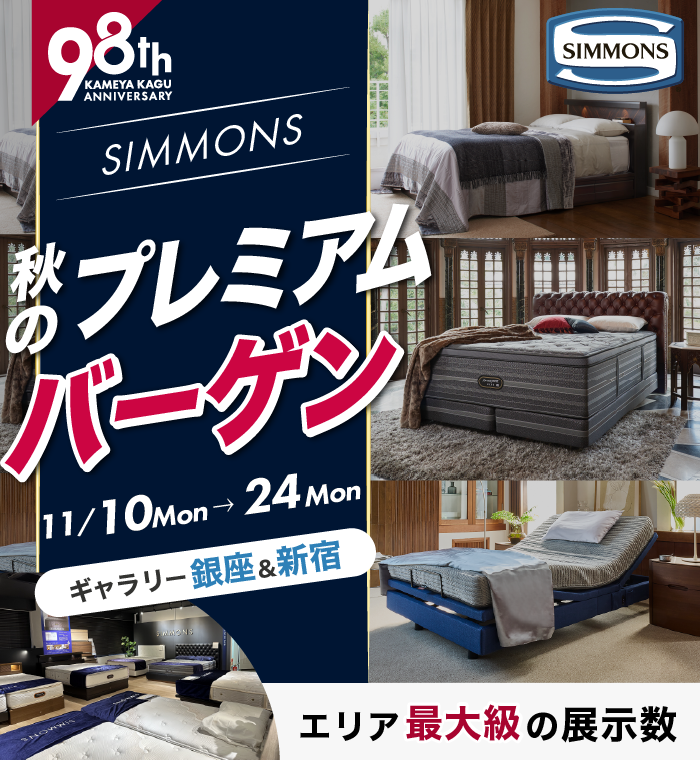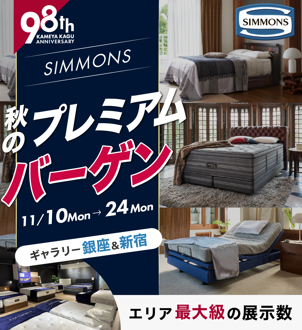 シモンズのすべてのマットレス・ベッドフレーム・電動リクライニングベッド・羽毛布団・寝装品を「特別価格」にてご提供!