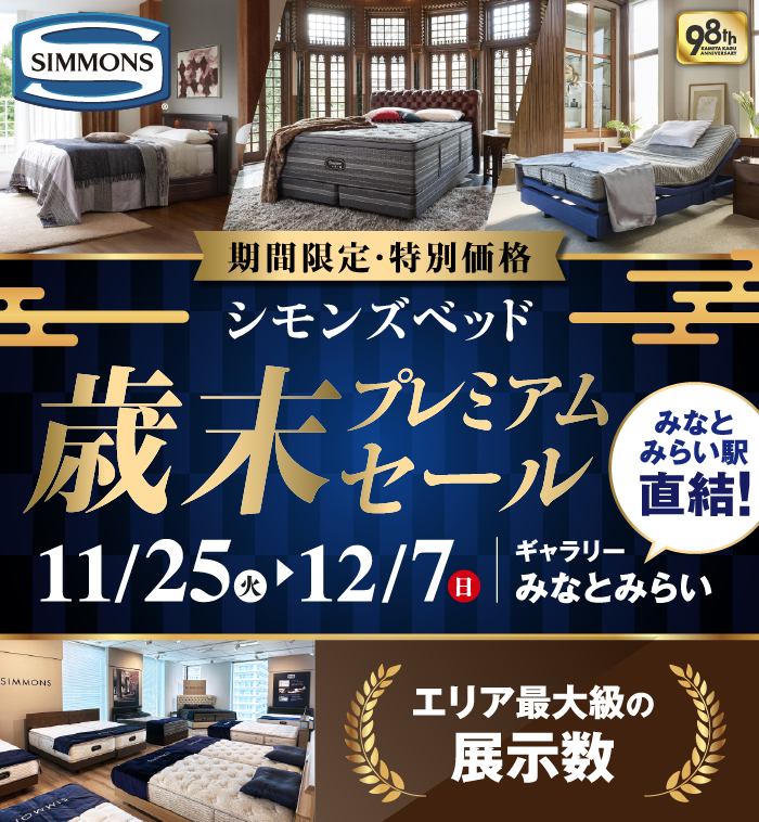 シモンズのすべてのマットレス・ベッドフレーム・電動リクライニングベッド・羽毛布団・寝装品を「特別価格」にてご提供!